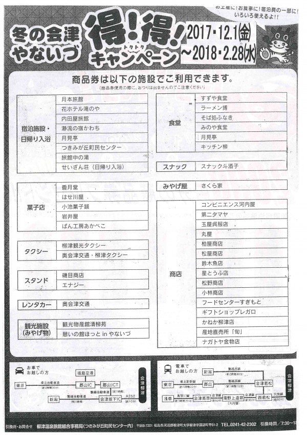 『冬の会津やないづ得!得!キャンペーン』実施中!